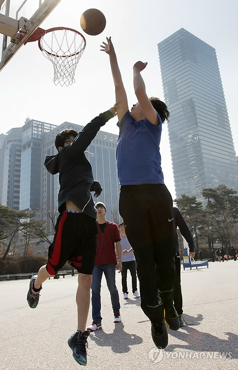 | △ '봄,봄,봄' (서울=연합뉴스) 윤동진 기자 = 만물이 겨울잠에서 깨어난다는 '경칩'인 6일 오후 서울 영등포구 여의도공원에서 시민들이 농구를 하고 있다. 2015.3.6 mon@yna.co.kr |