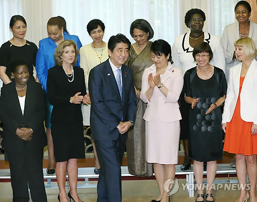 | △ 아베 신조(安倍晋三) 일본 총리가 2014년 9월 10일 도쿄 주재하는 여성대사들을 총리 관저로 초청해 오찬을 하고 기념사진을 촬영하고 있다. 아베 총리는 당시 오찬에서 "여성의 힘을 최대한 발휘할 수 있는 사회를 만드는 것이 아베 정권 성장전략의 큰 기둥"이라며 일본의 여성 정책을 홍보했다. (교도=연합뉴스 DB) |