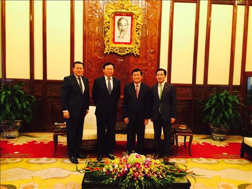 | △ 롯데그룹 신동빈 회장은 지난 6일, 베트남 하노이 대통령궁에서 쯔엉떤상(Truong Tan Sang) 대통령을 만나 호치민 투티엠지구 친환경 스마트시티 개발 사업 등 롯데의 베트남 현지 사업에 대해 설명하고 협력 방안에 관해 논의했다. 사진 왼쪽부터 황각규 롯데정책본부 운영실장, 신동빈 롯데그룹 회장, 쯔엉떤상 베트남 대통령, 김창권 롯데자산개발 대표 |