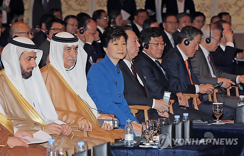| △ 한·사우디 비즈니스 포럼 참석한 박 대통령 (리야드=연합뉴스) 이정훈 기자 = 박근혜 대통령이 4일 오전(현지시간) 사우디아라비아 리야드 포시즌스호텔에서 열린 한국·사우디아라비아 비즈니스 포럼에 참석해 사회자의 발언을 듣고 있다. |