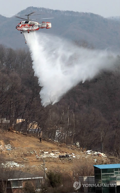 | △ 진화 나선 산림청 소속 헬기 (청주=연합뉴스) 김형우 기자 = 8일 오후 2시 30분께 청주시 상당구 수동의 한 주택에서 원인을 알 수 없는 불이 나 인근 야산으로 옮아붙자 산림청 소속 헬기가 출동해 이를 진화하고 있다. 이 불은 야산 0.1ha와 주택 100㎡ 등을 태우고 나서 1시간 만에 진화됐다. 2015.3.8 vodcast@yna.co.kr |