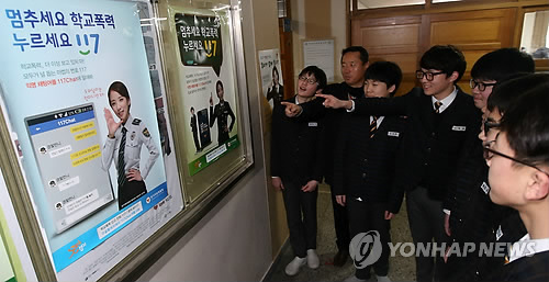 | △ 지난 3일 오전 경기도 수원시 장안구 수일중학교에서 학기 초 학교 폭력 예방을 위한 경기지방경찰청의 캠페인이 펼쳐져 교실 복도 게시판의 학교 폭력 예방 포스터를 학생들이 살펴보고 있다. |