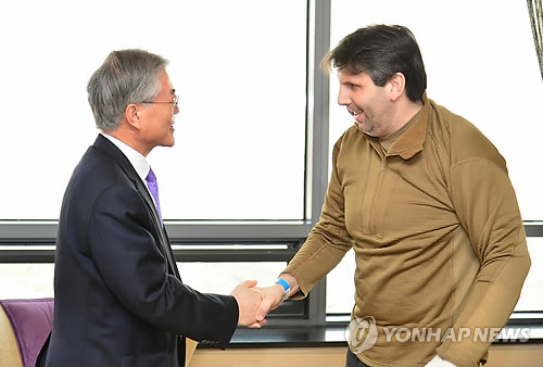 | △ 리퍼트 주한미국대사 만난 문재인 대표 (서울=연합뉴스) 새정치민주연합 문재인 대표가 8일 오후 서울 신촌 세브란스병원에서 입원 중인 마크 리퍼트 주한미국대사를 만나 악수를 하고 있다. (세브란스병원 제공) |