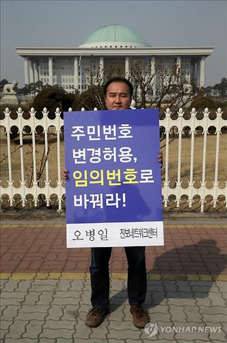 | △ (서울=연합뉴스) 배정현 기자 = 카드 3사 개인정보 유출사고가 발생한 후 지난해 2월, 오병일 진보네트워크센터 활동가가 국회 앞에서 주민등록번호 체계 개편을 요구하는 1인 시위를 벌이고 있다. 2014.2.17 |