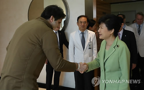 | △ 리퍼트 대사 병문안 하는 박 대통령 (서울=연합뉴스) 박근혜 대통령이 9일 오전 서울 세브란스병원에서 리퍼트 주한 미국대사의 병실을 방문해 위로하고 있다. (청와대 제공) |