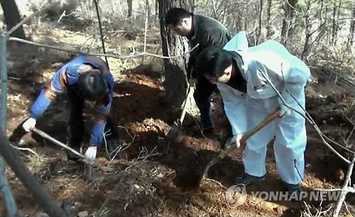 | △ 영아 사체 발굴 현장 (아산=연합뉴스) 한종구 기자 = 충남 아산경찰서는 자신의 어린 자녀 2명을 살해하고 암매장한 혐의(영아 살해 및 사체 유기)로 이모(39·여)씨를 구속했다. 경찰이 아산시 염치읍 한 야산에서 영아의 사체를 찾고 있다. 2015.3.9 << 아산경찰서 >> jkhan@yna.co.kr |