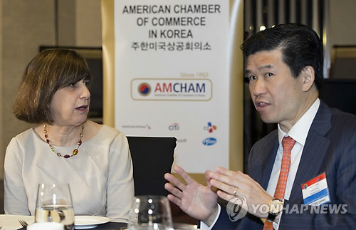 | △ 참석자와 대화하는 웬디 커틀러 대표보 (서울=연합뉴스) 윤동진 기자 = 웬디 커틀러 미국 무역대표부 대표보(왼쪽)가 9일 서울 종로구 JW메리어트 동대문스퀘어에서 열린 주한미국상공회의소 오찬간담회에서 참석자와 대화를 하고 있다. 2015.3.9 mon@yna.co.kr |