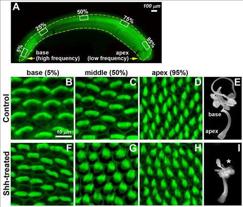 | △ (A) 포유류 청각기관의 달팽이관에 해당하는 조류 청각기관(basilar papilla)의 청각감각세포인 유모세포(hair cell). 기저부(base)는 고주파 소리에, 첨부(apex)는 저주파 소리에 반응. (B-D) 정상적인 유모세포. 기저부(base)에서 첨부(apex)로 갈수록 점차 넓이가 좁아지는 형태를 보임. (F-H) 미세수술로 Shh 신호전달체계를 비정상적으로 활성화시키자 기저부와 중간 부분의 유모세포 넓이가 현저히 좁아짐. 이는 유모세포가 인식할 수 있는 주파수 음역대가 바뀌었음을 나타냄. (E, I) 조류 청각기관의 전체적인 형태를 보여주는 사진. |