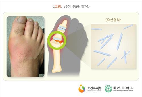통풍은 음식물이 대사되고 남은 '요산'이 몸속에 쌓이면서 발가락 관절, 발목관절이나 다리 등에 염증성 통증을 나타내는 질환이다. 통풍으로 발생하는 통증은 통풍이라는 이름처럼 어른도 울릴 만큼 심한데, 전체 통풍 환자의 90% 이상이 엄지발가락에 관절염 증상을 호소한다.