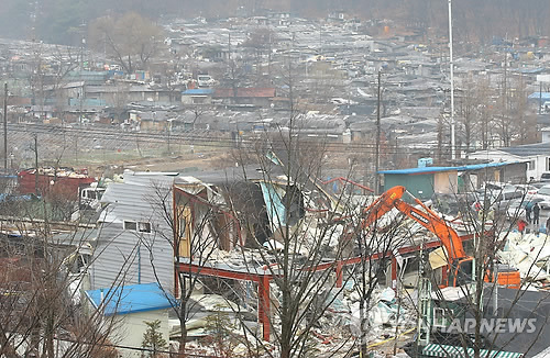 | △ 지난 달 16일 오전 서울 강남구 개포동 구룡마을에서 주민자치회관 철거 작업이 진행하고 있다. |