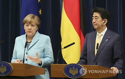 | △ (AP=연합뉴스) 일본을 방문 중인 앙겔라 메르켈 독일 총리(왼쪽)가 9일 도쿄의 총리 관저에서 아베 신조 일 총리와 공동 기자회견을 하고 있다. |