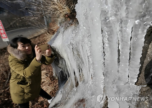 | △ 꽃샘추위가 만든 대관령의 고드름 (강릉=연합뉴스) 유형재 기자 = 강원 대부분 지역에 한파주의보가 내려진 10일 대관령의 아침 기온이 영하 12.1도까지 떨어지는 등 꽃샘추위가 기승을 부리자 옛 영동고속도로 대관령 구간의 도로변 절벽에 커다란 고드름이 만들어졌다. 2015.3.10 yoo21@yna.co.kr |