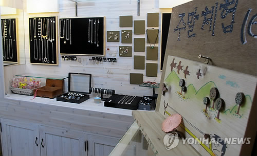 | △ 청주 수암골에 둥지 튼 금속공예 공방 (청주=연합뉴스) 황정현 기자 = 드라마 촬영지로 유명해진 청주시 수암골이 문화와 예술의 거리로 발돋움하고 있다. 사진은 정차연(40·여) 금속공예가의 공방에 차려진 공예품들. 2013.3.26 sweet@yna.co.kr |