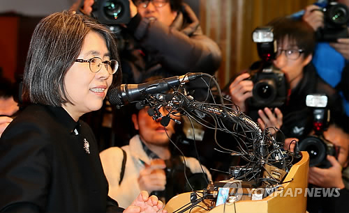 | △ 김영란 전 국민권익위원장 기자회견 (서울=연합뉴스) 박지호 기자 = 김영란 전 국민권익위원장이 국회가 처리한 김영란법이 졸속입법 및 위헌논란을 빚는 것과 관련해 10일 오전 서울 신수동 서강대학교 다산관에서 기자회견을 하고 있다. |