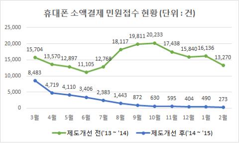 한편, 미래부는 지난해 3월부터 '휴대전화 소액결제 이용자 보호대책'을 추진한 결과, 휴대전화 소액결제 피해가 대책 시행 이전 1년간 18만6천889건에서 대책 시행 이후 1년간 2만7천808건으로 85.1% 감소했다고 밝혔다.