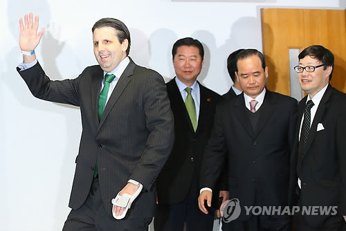 | △ 기자회견장 들어서는 리퍼트 대사 (서울=연합뉴스) 김도훈 기자 = 마크 리퍼트 주한 미국 대사가 10일 오후 서울 신촌세브란스 병원을 퇴원하기 전 기자회견을 위해 세미나실로 들어서고 있다. |