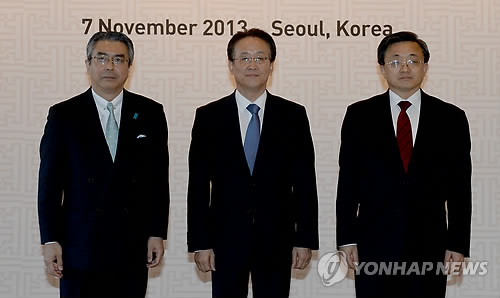 | △ 한중일 고위급 회의에 각국 대표로 참석하는 이경수 외교부 차관보(가운데), 류전민 중국 외교부 부부장(오른쪽), 스기야마 신스케 일본 외무성 외무심의관 (연합뉴스 자료사진) |