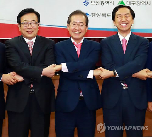 | △ 동남권 광역단체장 3인방 (울산=연합뉴스) 동남권 광역단체장인 서병수 부산시장, 홍준표 경남도지사, 김기현 울산시장(왼쪽부터)이 최근 잦은 접촉으로 소통과 연대 움직임을 보이고 있다. 지난해 10월 영남권 시도지사협의회에 참석한 3개 도시 단체장들. <<연합뉴스 DB>> 2015.3.11 |