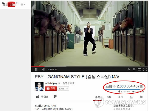 (샌프란시스코=연합뉴스) 임화섭 특파원 = 우리나라 가수 싸이의 뮤직비디오 '강남스타일'의 유튜브 조회 수가 시스템의 표시 한계를 초과해 구글이 시스템을 바꿨다고 발표했다.