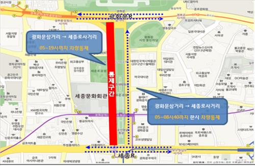 오전 5시부터 8시 40분까지는 마라톤 행사로 세종대로 양방향 모두 통제되고, 오전 8시 40분부터 오후 7시까지는 광화문 삼거리→세종대로 사거리만 통제된다.