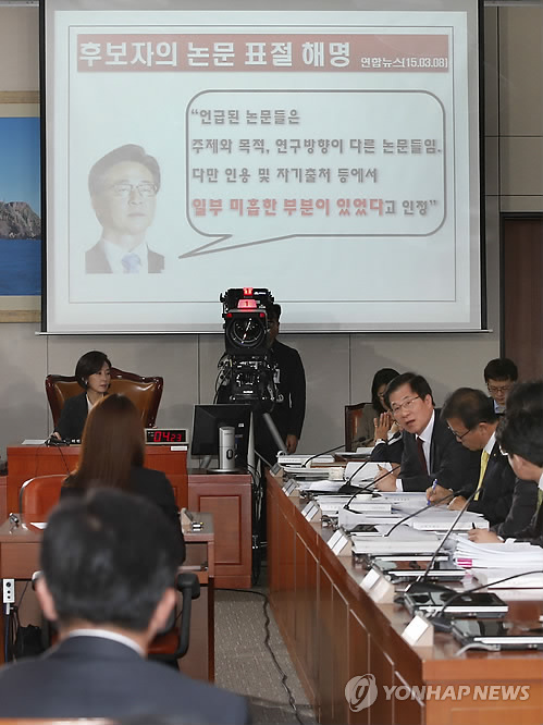 | △ 논문 표절 답변하는 홍용표 후보자 (서울=연합뉴스) 이상학 기자 = 홍용표 통일부 장관 후보자가 11일 오전 국회에서 열린 인사청문회에서 새정치민주연합 신경민 의원의 질의에 답변하고 있다. |