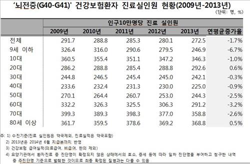 국민건강보험공단이 11일 발표한 2009~2013년 간질(뇌전증·질병코드 G40~41) 건강보험환자 진료비 지급자료에 따르면 9세 이하 아동의 인구 100만명당 간질 진료인원은 2009년 326.4명에서 2013년 246.9명으로 24.4% 줄었다.