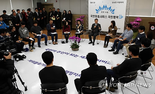 | △ 파워블로거와 정책토크하는 정종섭 장관 (서울=연합뉴스) 정종섭 행정자치부 장관이 11일 경기도 시흥시 신천동 주민센터에서 '달라지는 행정서비스, 국민행복 UP'이란 주제로 파워블로거와 함께 하는 생생 정책토크를 하고 있다. (행정자치부 제공) |