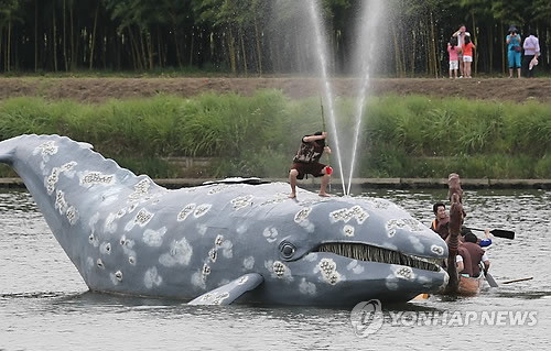 | △ '고래 잡은 사나이' (울산=연합뉴스) 김용태 기자 = 5일 오후 울산 남구 태화강에서 열린 '2014 울산고래축제'에서 선사고래잡이가 재연되고 있다. 2014.7.5 yongtae@yna.co.kr |