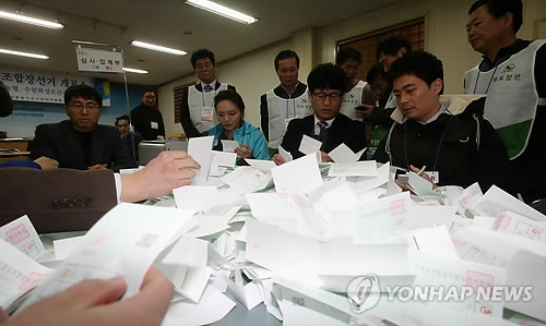 | △ 전국동시조합장 선거 개표 작업 (수원=연합뉴스) 신영근 기자 = 제1회 전국동시조합장 선거일인 11일 오후 경기도 수원시 팔달구선관위에서 선관위 직원들이 수원농협과 경기남부수협 행궁동 투표소의 투표함을 개함, 개표 작업을 진행하고 있다. |