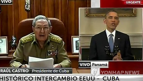 | △ 미국과 쿠바가 직통 전화까지 재개통해 국교 완전 정상화에 한 걸음 더 다가섰다. 사진은 지난해 12월 17일(현지시간) 버락 오바마(오른쪽) 미국 대통령과 라울 카스트로 쿠바 국가평의회 의장이 각각 수도인 워싱턴과 아바나에서 전국에 중계된 실황방송을 통해 양국 관계 정상화를 선언하고 있는 모습.(AP/TN채널=연합뉴스) |