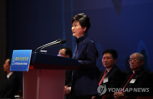 | △ 인사말하는 박근혜 대통령 (서울=연합뉴스) 도광환 기자 = 박근혜 대통령이 12일 오전 서울 강남구 코엑스에서 열린 제47회 국가조찬기도회에 참석, 인사말을 하고 있다. |