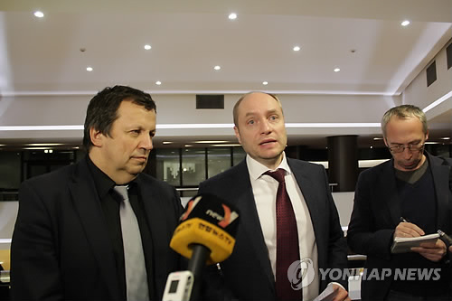 | △ 알렉산드르 갈루슈카 러시아 극동개발부 장관이 지난 2월 25일(현지시간) 모스크바 시내 아지무트 호텔에서 열린 북-러 기업협의회 1차회의에 참석한 뒤 기자들에게 회의 결과를 설명하고 있다. <<연합뉴스DB>> |