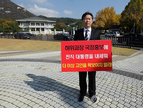| △ 참여정부 홍보참모 1인시위 (서울=연합뉴스) 최재구 기자 = 참여정부시절 홍보참모를 지낸 인사들이 서울 청와대앞 분수대에서 FTA와 관련해 현 정부를 규탄하는 릴레이 1인시위를 벌였다. 정태호 전 청와대 대변인이 1인시위에 참여해 있다. 2011.10.30 jjaeck9@yna.co.kr |
