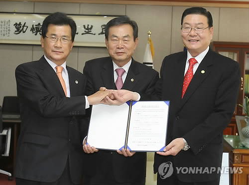 | △ 충북 무상급식 예산 분담 '통 큰 합의'…메뉴얼 마련 (청주=연합뉴스) 심규석 기자 = 김광수(가운데) 충북도의회 의장의 중재로 이시종(왼쪽) 충북지사와 이기용 도 교육감이 12일 초·중학교 무상급식비 예산 분담에 필요한 '메뉴얼'에 합의했다. 2013.11.12 <<충북도의회 제공>> |