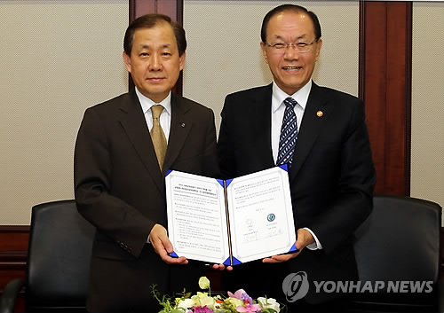 | △ 교육부-한국외대, '2015 세계교육포럼' 성공 개최 MOU 체결 (서울=연합뉴스) 12일 오후 서울 동대문구 한국외대에서 황우여 사회부총리 겸 교육부 장관(오른쪽)과 김인철 한국외대 총장이 오는 5월 인천에서 열리는 '2015 세계교육포럼'의 성공적인 개최를 위한 업무협력(MOU)을 체결하고 있다. ( 한국외대 제공) |