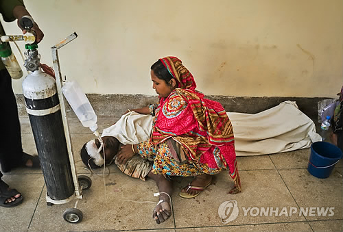 | △ 12일(현지시간) 방글라데시 쿨르나 병원에서 시멘트공장붕괴사고로 다친 노동자를 아내도 돌보고 있다.(AP=연합뉴스) |