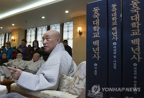 | △ 12일 오전 차기 총장 선임을 놓고 극심한 내홍을 겪는 동국대에서 이사장 일면 스님(가운데)이 본관 이사장실에서 학교 관계자 및 학생들과 대화를 나누고 있다. |