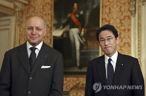 | △ 로랑 파뷔우스(왼쪽) 프랑스 외무장관이 2015년 1월 18일 파리를 방문한 기시다 후미오 일본 외무상과 나란히 서 있다.(AP=연합뉴스 DB) |