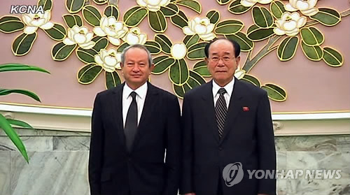| △ 나기브 사위리스 오라스콤텔레콤 회장(왼쪽)이 지난 2012년 2월 방북해 김영남 북한 최고인민회의 상임위원장과 평양 만수대의사당에서 기념사진을 촬영하고 있다. <<연합뉴스DB>> |