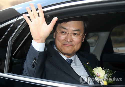 | △ 작별 인사하는 서승환 국토교통부 장관 (세종=연합뉴스) 배재만 기자 = 서승환 국토교통부 장관이 13일 오후 정부세종청사 대강당에서 이임식을 마친 후 차량에 올라 직원들에게 손을 흔들며 인사하고 있다. 2015.3.13 scoop@yna.co.kr http://blog.yonhapnews.co.kr/f6464 |