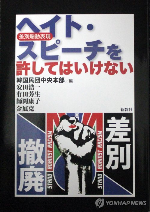 | △ 혐한 시위의 심각성을 지적한 책 (도쿄=연합뉴스) 이세원 특파원 = 재일본대한민국민단은 프리랜서 저널리스트 야스다 고이치(安田浩一) 씨, 아리타 요시후(有田芳生) 참의원(민주당), 모로오카 야스코(師岡康子) 변호사, 재일 한국인 3세인 긴 노부카쓰(金展克) 씨 등 4명이 혐한 시위에 관해 쓴 글을 엮어 단행본 '헤이트 스피치를 허락하면 안 된다'(신칸샤<新幹社>)를 최근 펴냈다. 헤이트 스피치를 허락하면 안 된다의 표지. 2014.11.13 sewonlee@yna.co.kr |