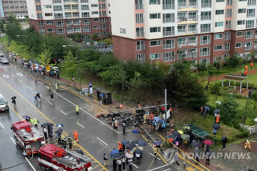 | △ 아파트단지 옆에 추락한 헬기 (광주=연합뉴스) 박철홍 기자 = 17일 오전 광주 광산구 장덕동 수완지구 아파트 단지 바로 옆 인도에 소방헬기가 추락했다. 사진은 사고직후 수습 중인 현장의 모습. 2014.7.17 pch80@yna.co.kr |