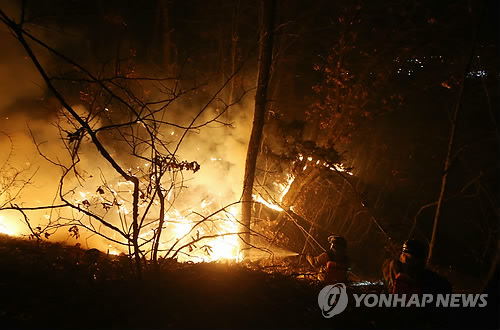 | △ 불암산에 큰 불 (서울=연합뉴스) 김주성 기자 = 14일 새벽 서울 노원구 불암산에서 소방관들이 진화작업을 벌이고 있다. 전날 오후 10시 59분께 불암산 중턱 학도암 부근에서 발생한 화재는 정상 방향으로 옮겨 붙고 있어 소방 당국은 장비 20여대와 인원 100여명을 동원해 진화 중이다. 2015.3.14 utzza@yna.co.kr |
