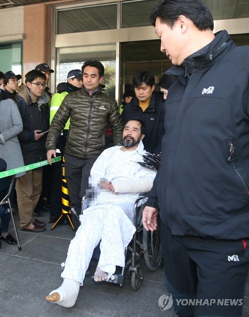 | △ 경찰병원 퇴원하는 김기종 (서울=연합뉴스) 임헌정 기자 = 마크 리퍼트 주한 미국대사를 흉기로 습격한 김기종 씨가 발목 골절 수술을 마치고 14일 오전 서울 송파구 가락동 경찰병원에서 퇴원하고 있다. |