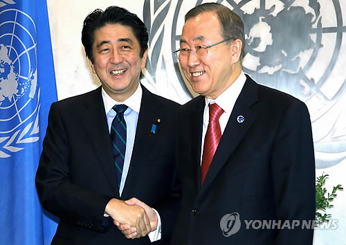 | △ 반기문 유엔 사무총장(오른쪽)과 아베 신조 일본 총리 (AP=연합뉴스 자료사진) |