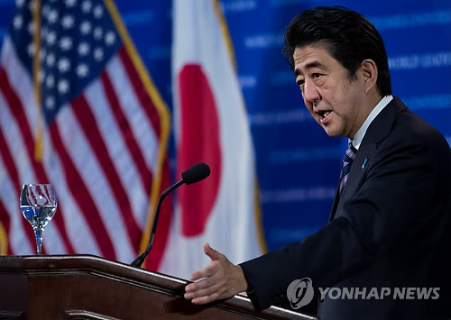 | △ (AP=연합뉴스 자료사진) 지난해 9월22일 아베 신조(安倍晋三) 일본 총리가 미국 컬럼비아대학에서 열린 한 포럼에서 연설하는 모습 |