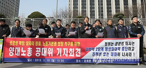 | △ (서울=연합뉴스) 박지호 기자 = 16일 오전 정부서울청사 앞에서 '공공성 확장, 일자리 확충, 노동기본권 보장 촉구를 위한 양대노총 공대위 기자회견'이 열리고 있다. 2015.3.16 jihopark@yna.co.kr |