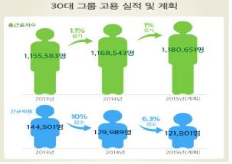 30대 그룹의 신규채용은 2013년 14만4천501명에서 2014년 12만9천989명으로 10% 감소한데 이어 올해 12만1천801명으로 6.3% 감소할 것으로 나타났다.