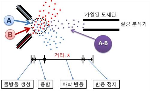 연구진은 이 연구에서 시료 물질의 원소 조성, 분자 구조, 동위원소 비율 등을 측정하는 질량분석 장치에 고속으로 충돌해 융합하는 마이크로 융합물방울을 이용해 액체상태 생화학반응을 3㎲(100만분의 3초) 단위로 볼 수 있는 기술을 접목했다.