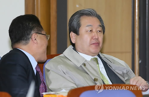 | △ 대화하는 김무성 (서울=연합뉴스) 진성철 기자 = 새누리당 김무성 대표(오른쪽)가 17일 국회 의원회관에서 열린 '통일경제교실' 모임에서 정운천 전 농림부 장관과 대화하고 있다. |